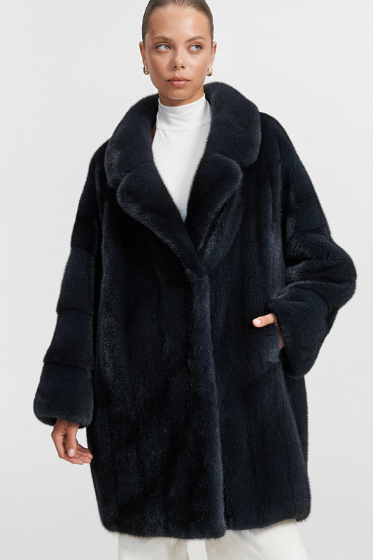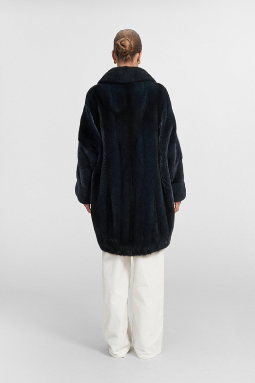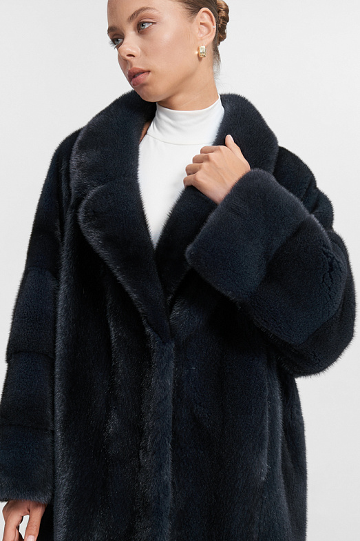 Шуба из скандинавский норки с английским воротником и асиметричным подолом. ( спинка изделия кроится длиннее, чем полочки) У шубы рубашечный рукав с заниженной проймой. При пошиве издения используются шкуры норки в вертикальной раскладке. Модель застегивается на 4 шубные клипсы, имеется дополнительная застежка-магнит в воротнике. Шуба оснащена двумя карманами