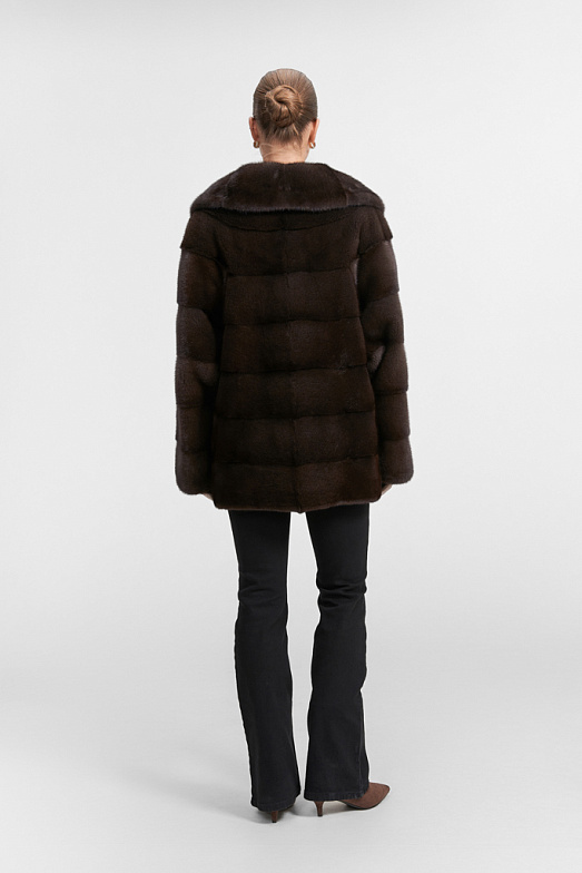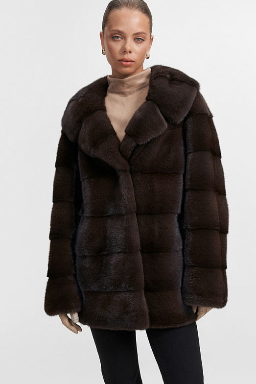 Короткая шуба из скандинавской норки с объемным воротником из баргузинского соболя натурального цвета. Сложный рукав на основе реглана с отрезной кокеткой и заниженной проймой придает особый шарм изделию, делает его невероятно удобным. В модели используется поперечная раскладка меха. Имеются прорезные карманы. Модель застегивается на 3 шубные клипсы, на воротнике есть дополнительная застежка — потайная пуговица
