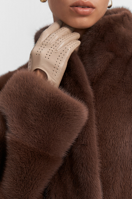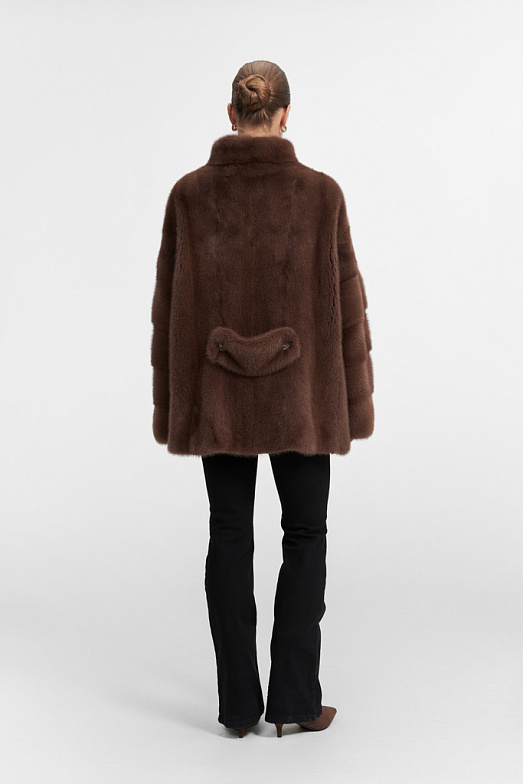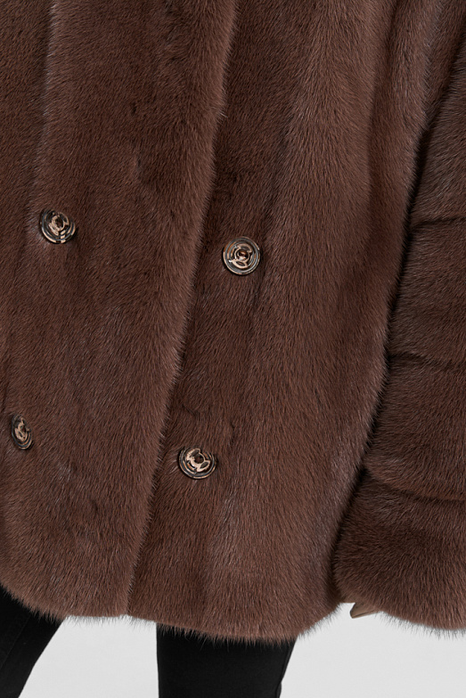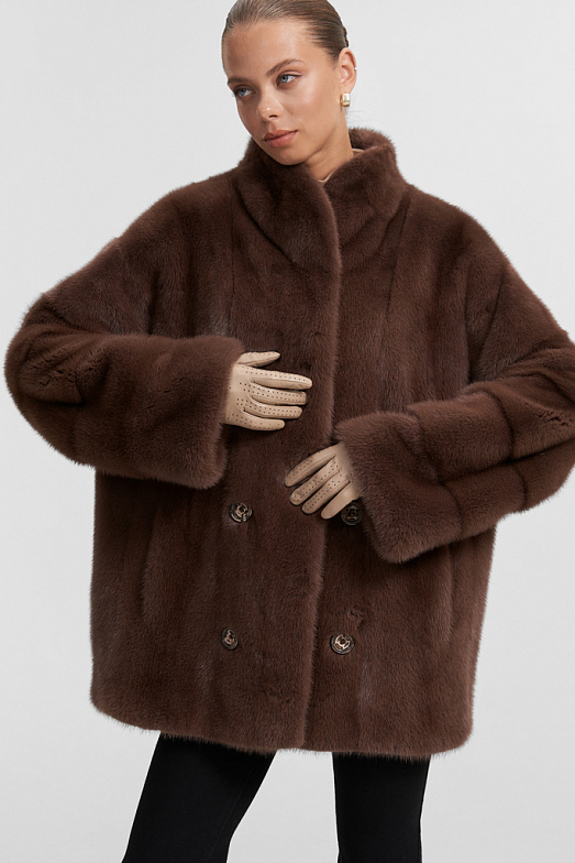 Короткая шуба из российской норки. Шуба оверсайз подходит на размеры от 44 до 50. При пошиве используется классическая раскладка шкур — вдоль. Воротник — стойка кимоно. Рукав рубашечный спущенный с заниженной проймой. Используются декоративные пуговицы для имитации двубортности. Шуба застегивается на 3 шубные клипсы и верхний магнит. Также в изделии имеются прорезные карманы. На спинке при пошиве используется декоративный элемент — хлястик