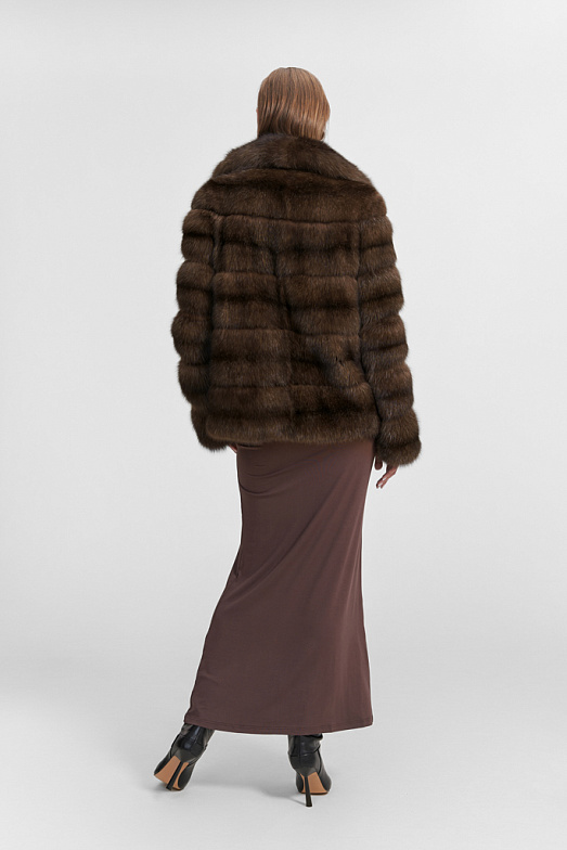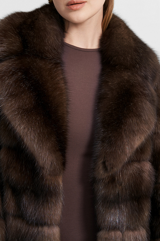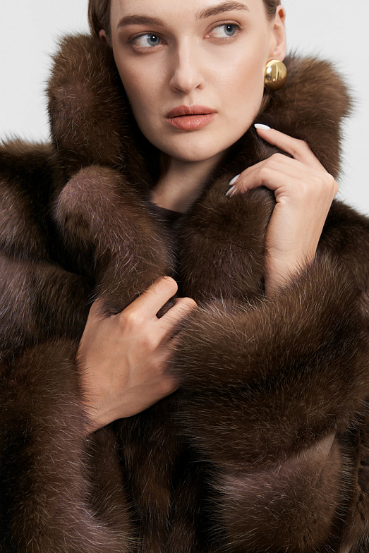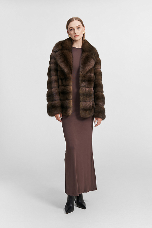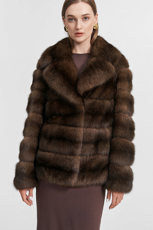 Короткая шуба из баргузинского соболя с английским воротником. Классический силуэт модели имеет рукав — полуреглан. Расположение шкурок — поперечное в целую шкуру. Стачивание деталей происходит через замшу по технологии росшив. Шуба застегивается на 3 шубные клипсы, воротник можно застегнуть на потайной крючок. Модель оснащена двумя карманами