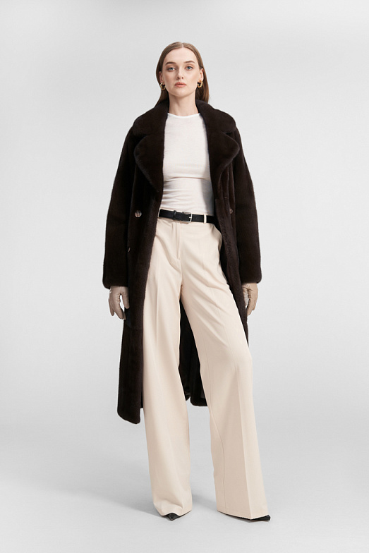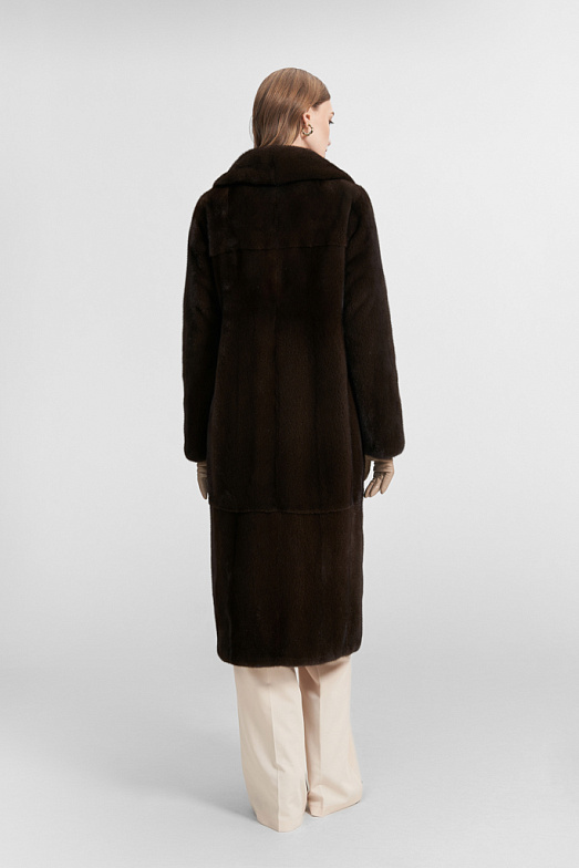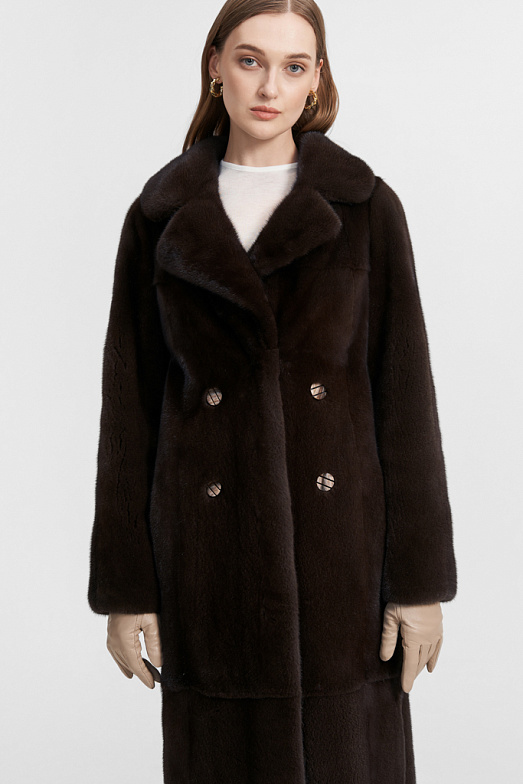 Шуба из скандинавской норки с английским воротником. На модели рукав полуреглан, также разрезы в боковых швах. Шуба оснащена двумя карманами. Модель застегивается на 4 шубные клипсы и имеет застежку-магнит на воротнике. В модели используются 4 декоративных пуговицы для имитации двубортности