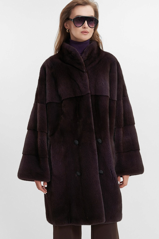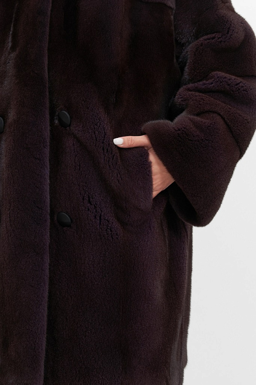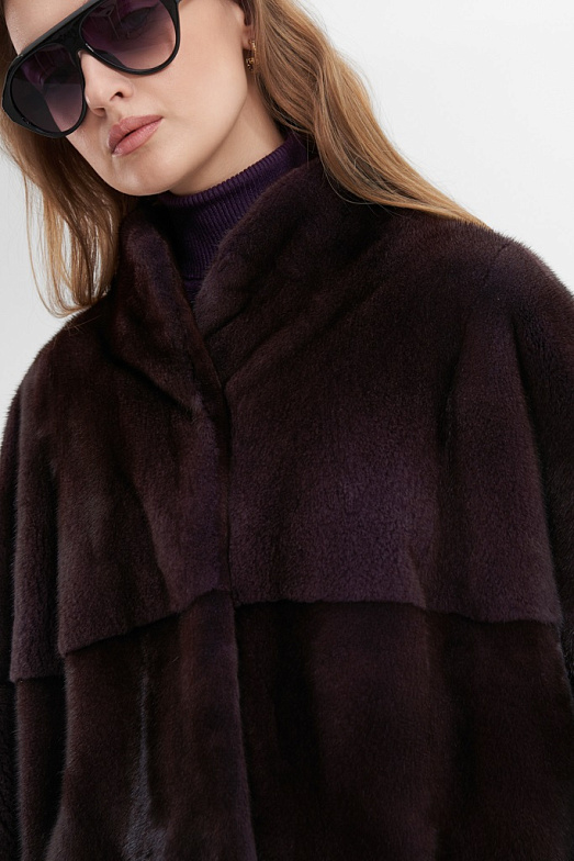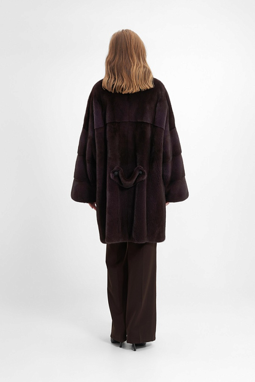 Укороченная шуба из скандинавской норки. Шуба оверсайз подходит на размеры от 50 до 56. При пошиве используется классическая раскладка шкур — вдоль. Воротник — стойка кимоно. Рукав рубашечный спущенный с заниженной проймой. Используются декоративные пуговицы для имитации двубортности, на спине есть декоративный хлястик. Шуба застегивается на 4 шубные клипсы и верхний магнит. Также в изделии имеются прорезные карманы